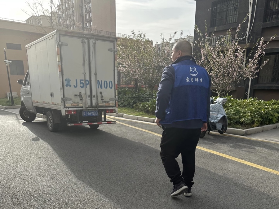市民潘女士在小区内遇到了声称为盒马鲜生送货的商贩。