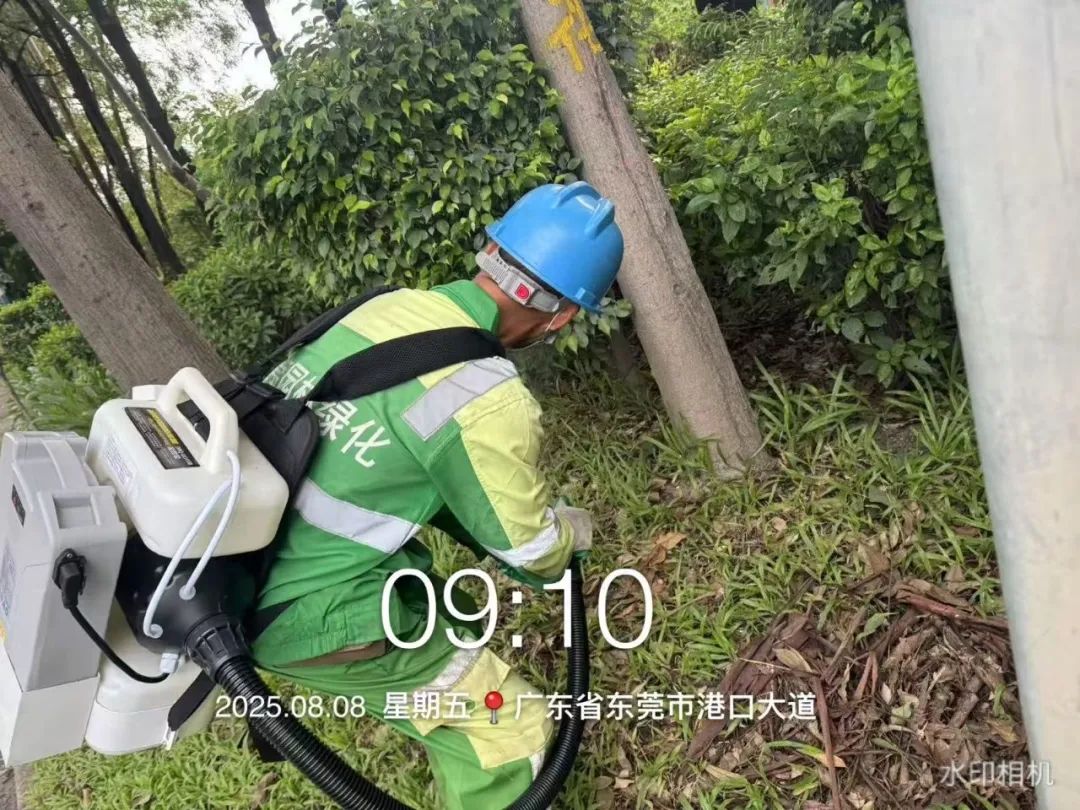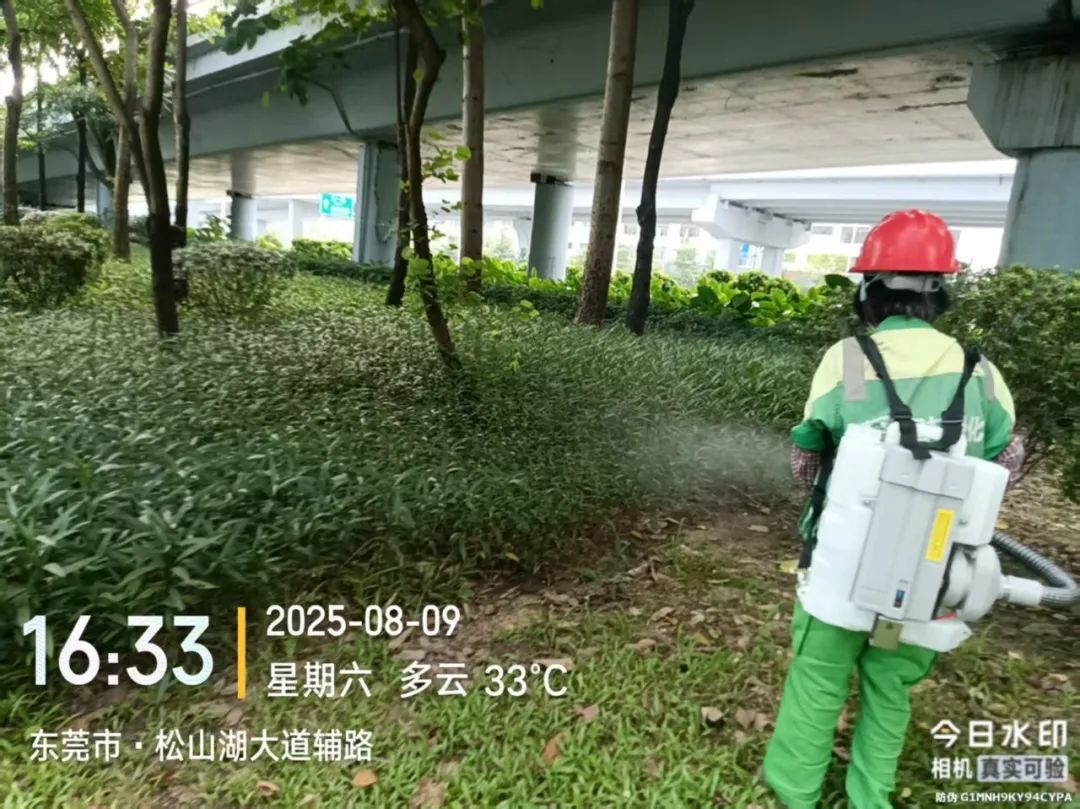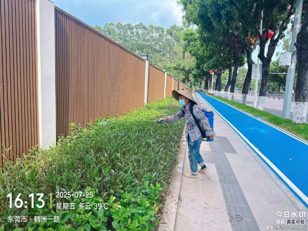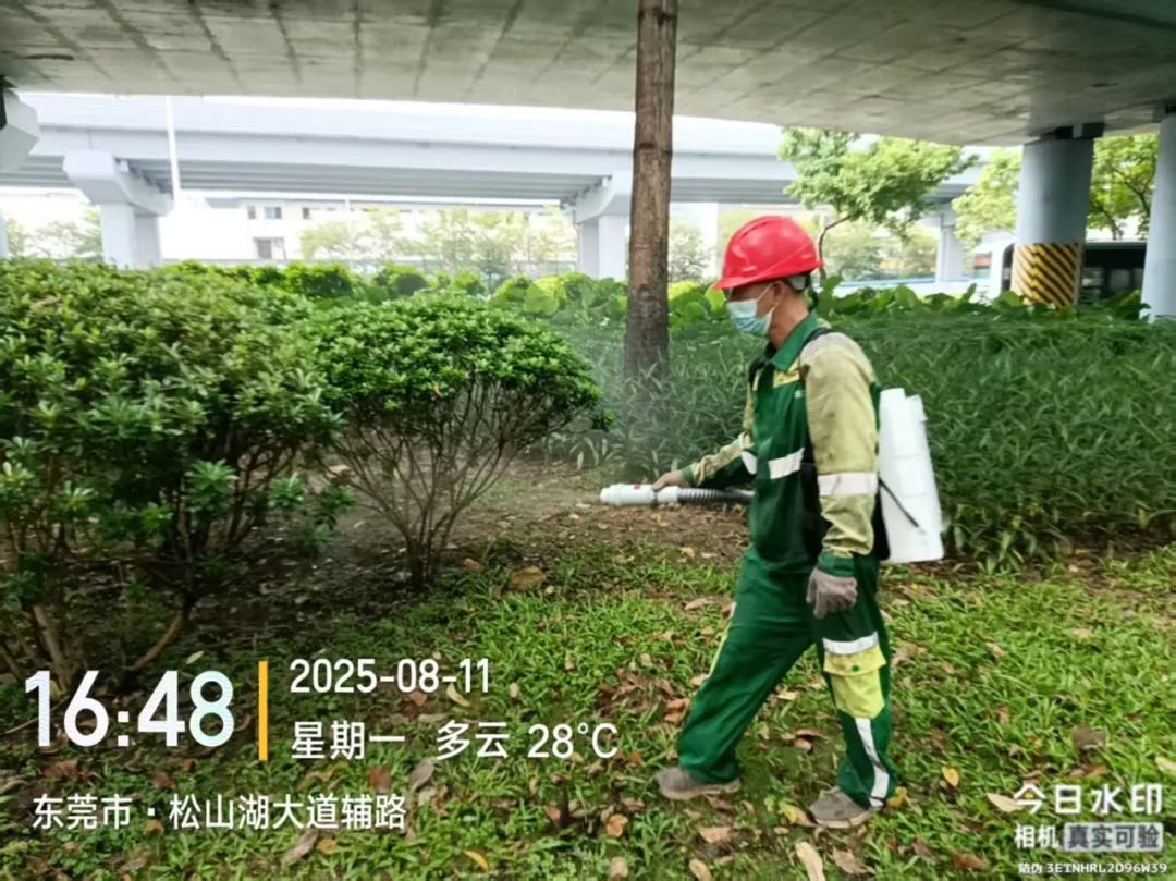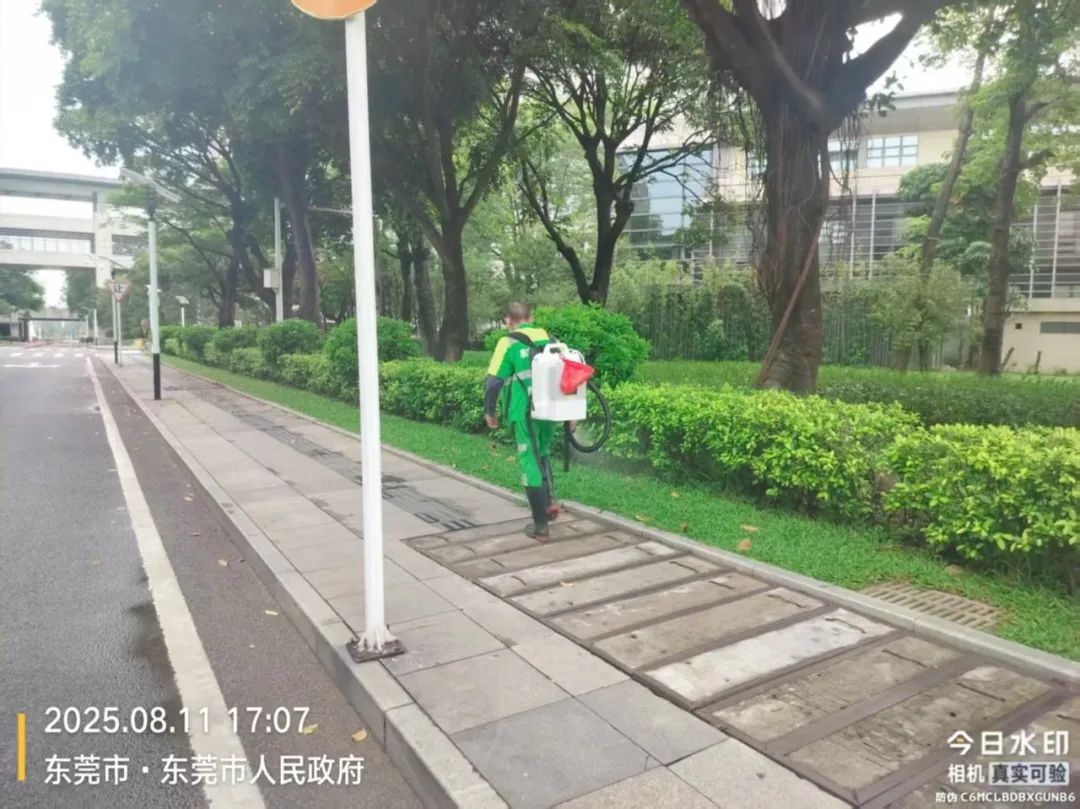 为做好灭蚊防蚊工作,艺林公司在园林绿化养护工作中,使用超低容量喷雾器和菊脂类灭蚊药剂,对八一路段、松山湖大道救助站至中医院路段、小坑至篮球中心路段,以及人流密集区域的绿化带实施灭蚊消杀作业。作业时避免对市民出行造成干扰,并确保药剂在低风速条件下高效扩散。消杀过程中,工作人员配备专业防护装备,严格按照操作规范执行,重点针对绿化带中的积水点和植被密集区喷洒药剂,以彻底清除蚊虫孳生源。