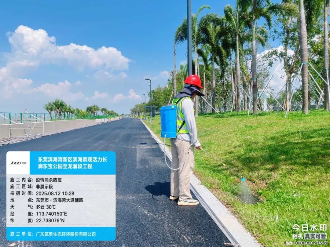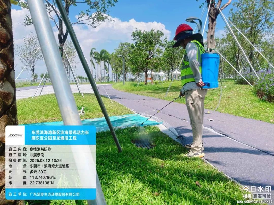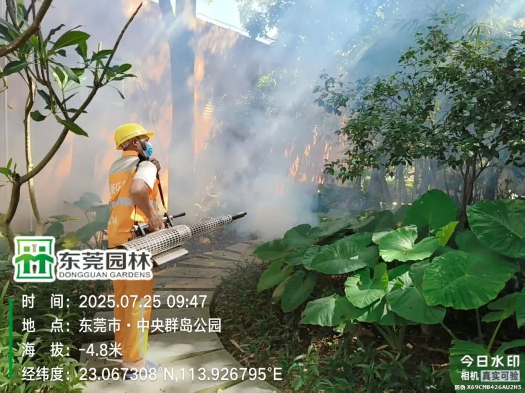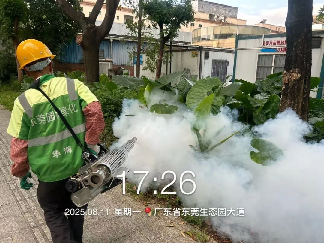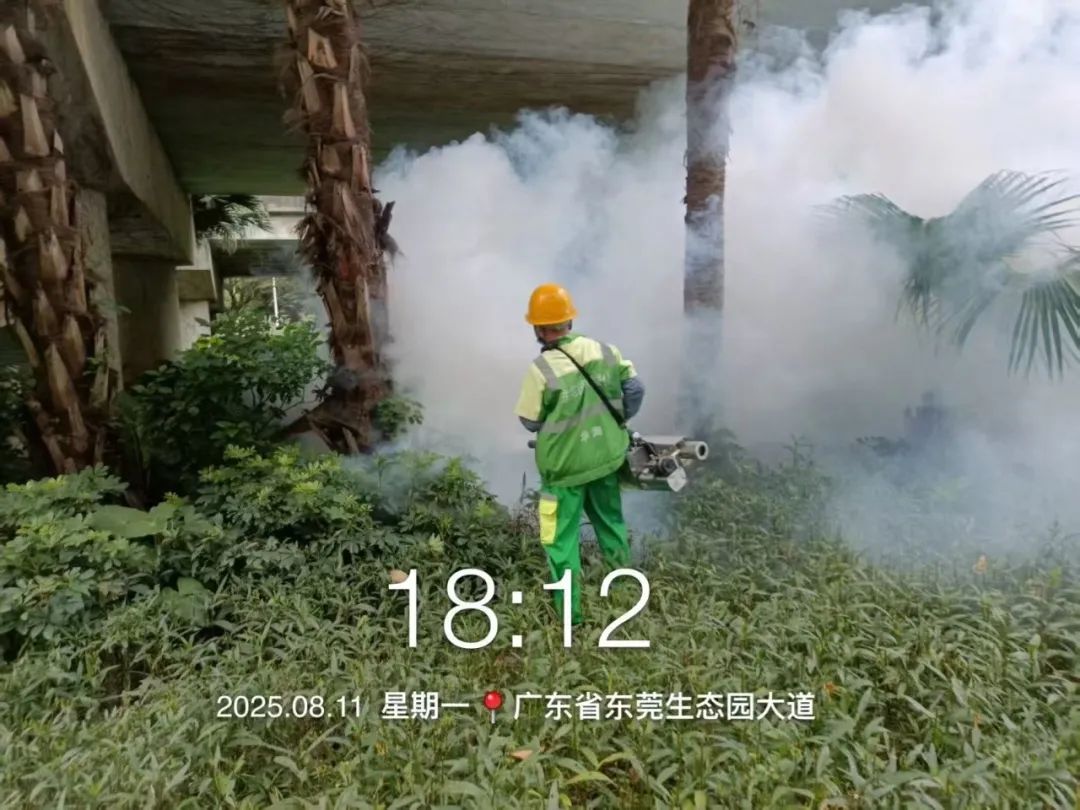 为做好灭蚊防蚊工作,艺林公司在园林绿化养护工作中,使用超低容量喷雾器和菊脂类灭蚊药剂,对八一路段、松山湖大道救助站至中医院路段、小坑至篮球中心路段,以及人流密集区域的绿化带实施灭蚊消杀作业。作业时避免对市民出行造成干扰,并确保药剂在低风速条件下高效扩散。消杀过程中,工作人员配备专业防护装备,严格按照操作规范执行,重点针对绿化带中的积水点和植被密集区喷洒药剂,以彻底清除蚊虫孳生源。