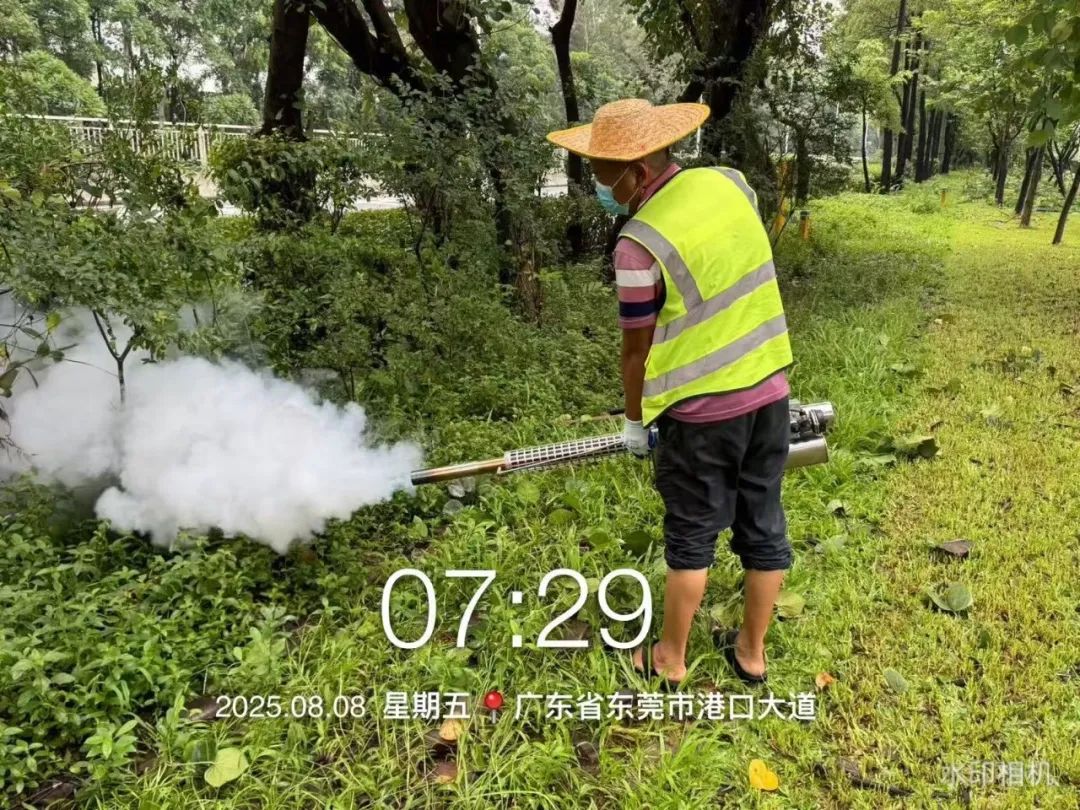 邑新公司在虫媒传染病防控关键时期,邑新公司积极响应号召,强化重点区域消杀,组织专业团队,对主次干道、背街小巷、公园绿地、河道沿岸等易滋生区进行排查与高频次消杀。运用背负式喷雾器、烟雾机等设备,重点喷洒绿化带,并组织清理旧屋杂草,防止蚊虫在密集区域的滋生。